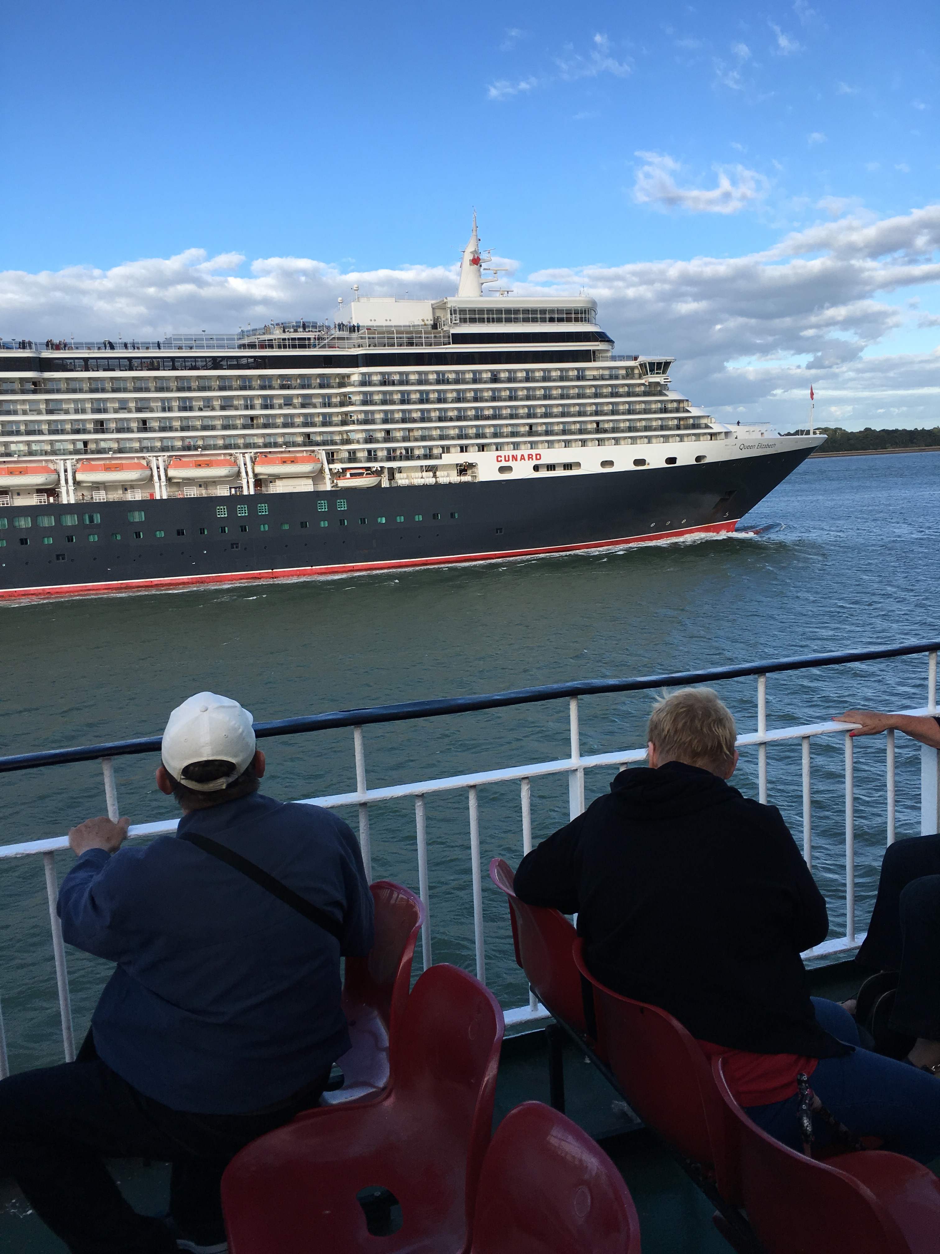Our boat was delayed because a bigger boat was in the way, the massive Queen Elizabeth cruise ship. It kept pace with us for a while, most of the passengers up on deck and waving at us. Some people waved back. I have no idea what that achieves.