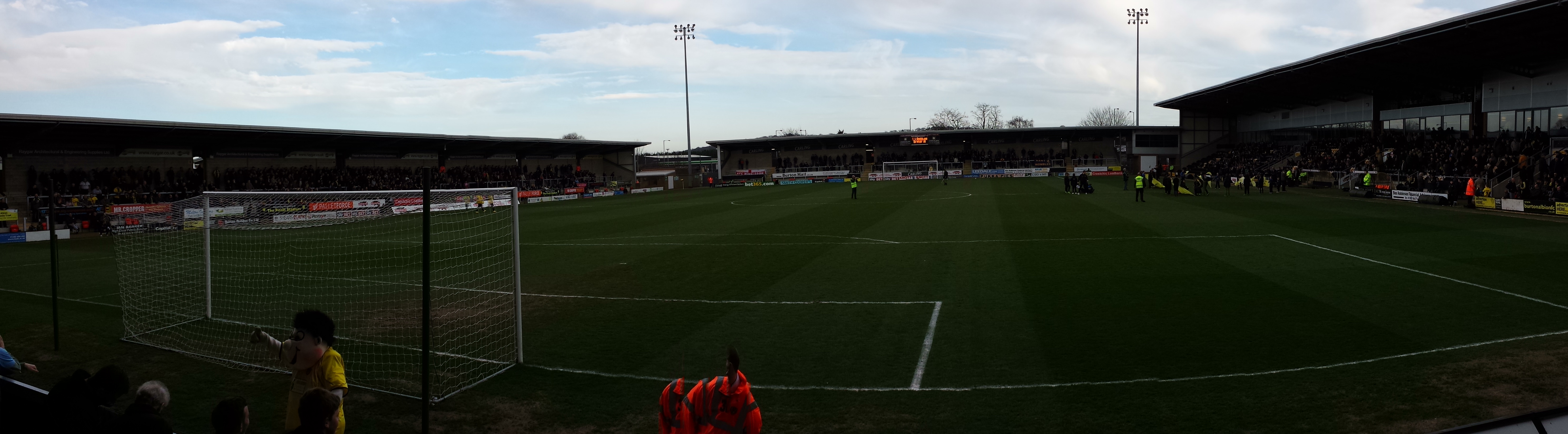 Once in Mansfield we parked up and walked along to Field Mill (now renamed as the One Call Stadium) and had a little wander around the outside. As we walked down the street that we’d parked on, Tom managed to find a discarded blade of some sort on the floor and we speculated how it got there – obviously the answer won’t be as fantastical as the suggestions that we came up with. The away end at Field Mill sticks out into a retail park that has my ideal day out with my daughter summed up in two shops: Maplins for me (I like looking at electronics and making plans for projects that I will never construct) with Pets at Home next door (so my daughter can go and look at fish and hamsters). Underneath the far side of that end was a mattress, suggesting that someone lives there on a semi-permanent basis. If we’d have known, we could have stole him a tent. Whoever it belonged to had popped out for the day, a good idea as the Burton fans (who were superb throughout) would have kept him awake with their noise if he fancied a nap.